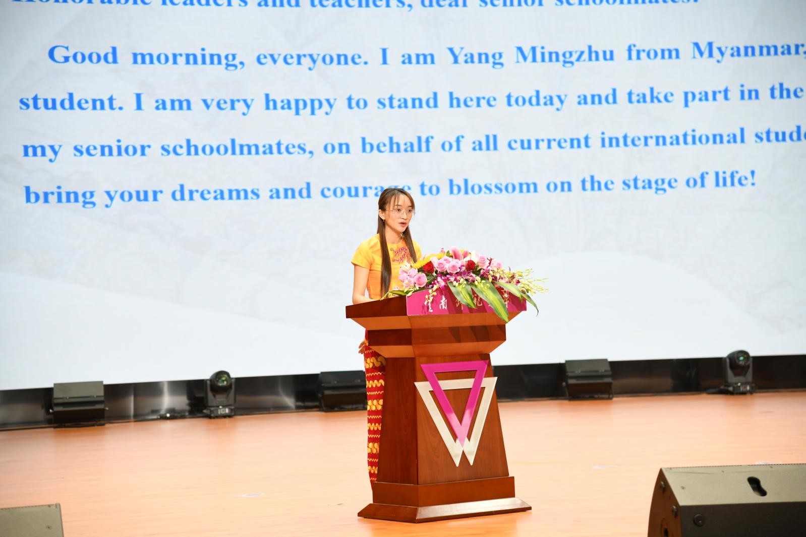 来自缅甸的杨茗珠同学作为在读国际学生代表向学长学姐表达欢送和祝贺。她回忆了入学后学长学姐对学弟学妹们的帮助和引导,表示将不负期许,脚踏实地学习专业知识,赶上学长学姐的脚步,共赴美好的未来。