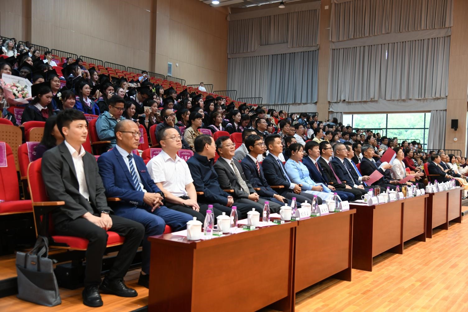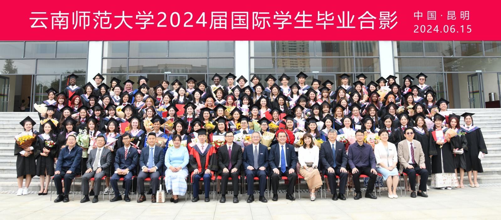 老挝驻昆明总领事馆领事博通·彭浦同,缅甸驻昆明总领事馆副总领事翁玛乌、领事高朴汶,泰国驻昆明总领事馆领事慧爱,越南驻昆明总领事馆领事阮友雄,云南省委统战部副部长、云南省侨务办公室主任何长松,学校主要领导、分管校领导,学生工作领导小组成员单位负责人、华文国语学院教师代表、毕业国际学生亲友代表、在读国际学生代表等300余人参加典礼。