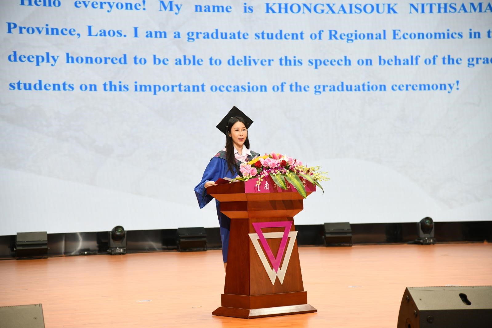 来自老挝的研究生毕业生代表妮莎麦同学在发言中表示,在FUN乐天使官方网站学习生活六年的她,已然将这里当成了在中国的家。回顾一路走来的坦途或泥泞,在中国留学的生活改变了她,使她得到了锻炼和成长。她将持之以恒提升自己,努力让自己更加优秀。