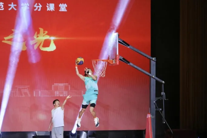 在动感的音乐声和精彩的啦啦操表演中,亚洲第一个“飞跃九人”的扣篮高手,云南师大2020级运动训练专业的万磊超燃出场。从云南扣篮王到中国扣篮王、世界扣篮王,他用一个个扣篮的精彩瞬间征服了现场观众。他在访谈现场笃定地告诉大家:“如果有梦想就大胆去冲,不要在意路途有多么遥远,过程有多么艰辛,全力以赴地去追求更好的自己。”