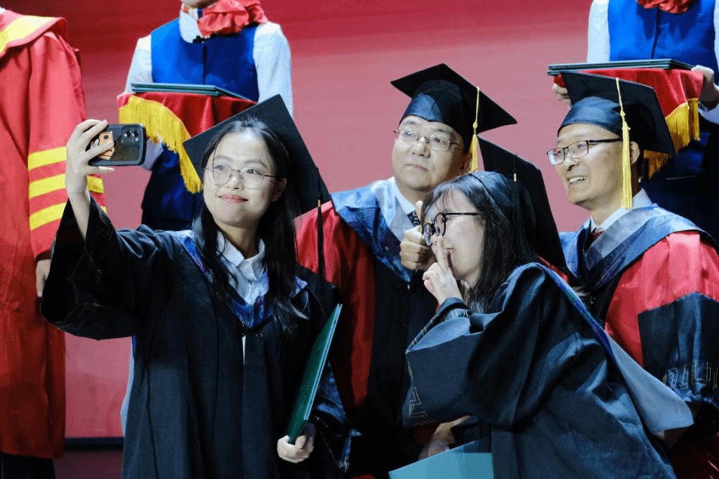 “歌唱我们亲爱的祖国,从今走向繁荣富强……”全体师生合唱《歌唱祖国》,用歌声表达对祖国的热爱和对母校祝福。曲终人不散,许多毕业生拿出手机,在毕业典礼现场拍照留念,定格大学时光的青春记忆。