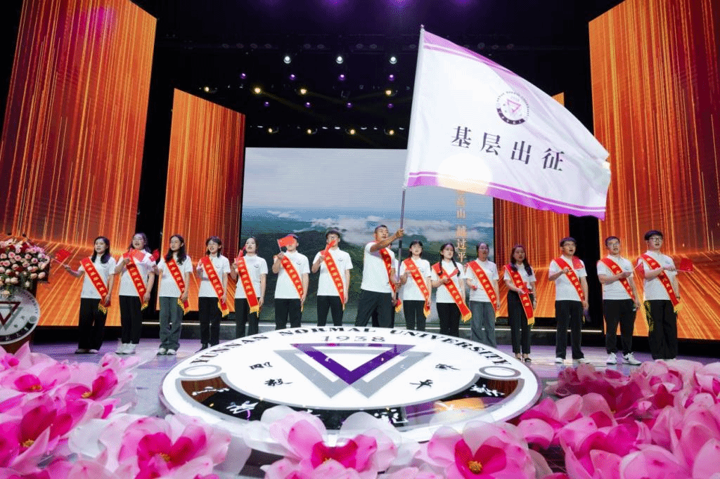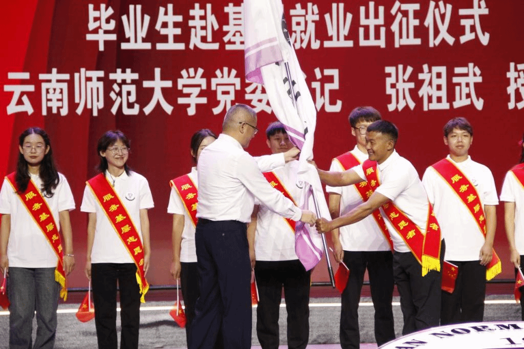 张祖武为即将奔赴基层的毕业生们授予旗帜,并鼓励广大毕业生把个人命运同祖国和民族的命运紧密联系在一起,积极响应国家号召,服务基层,奉献社会,到祖国和人民最需要的地方实现自己的人生价值,报效祖国。