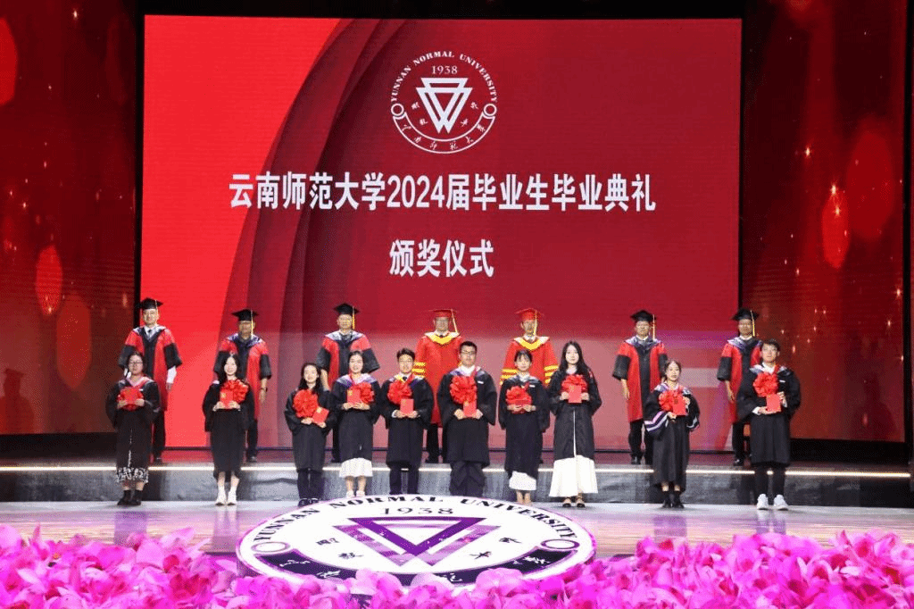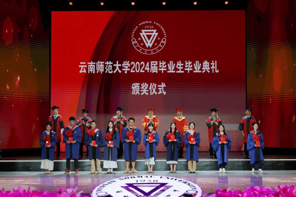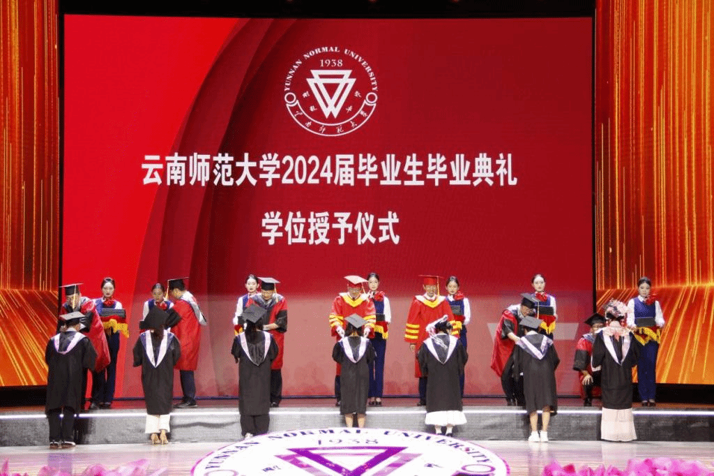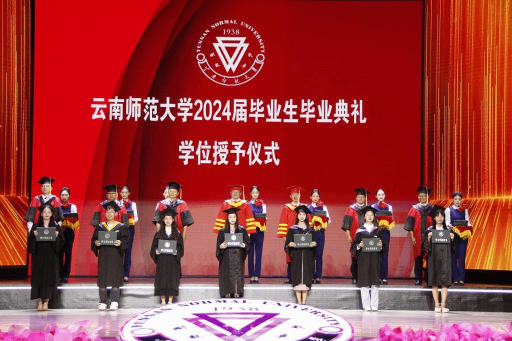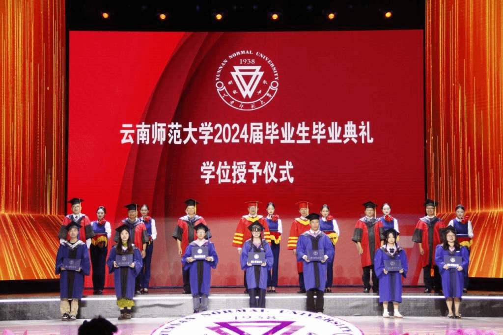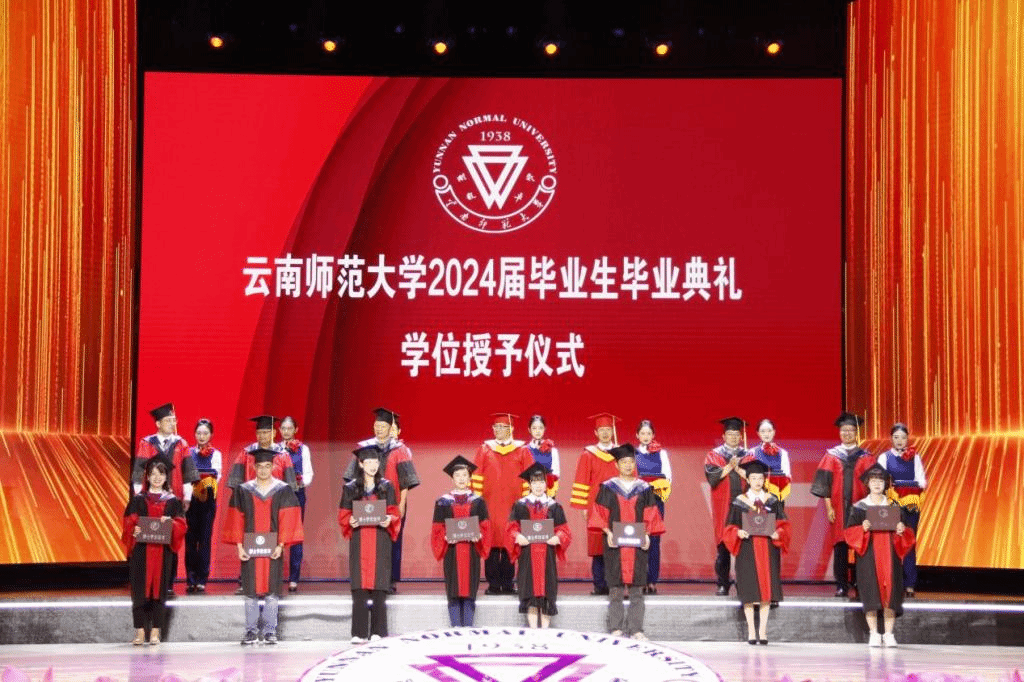 “学海无涯勤是岸,云程有路志为梯。”硕士毕业生代表杨愫深情回顾了在云师的七年时光,她积极参与实践活动,发挥法学专业特长,将法律带回家乡,多次到农村和学校参与普法宣讲。现在她将作为一名定向选调生回到家乡德宏,扎根基层,服务人民,在祖国边疆奉献青春之力。本科毕业生代表王柏超分享了他在云师四年的热血与汗水。作为国家一级篮球运动员,代表学校参加第16届云南省运动会等多个项目比赛并取得好成绩的他,光荣地成为了学校研究生支教团成员。他将把服务基础教育的初心带到祖国需要的地方去,帮助孩子们养成健康锻炼的习惯和优秀的体育品格。博士研究生代表邵文忠用严谨治学、艰辛喜悦、砥砺前行三个关键词回顾了自己在云师的求学经历。虽然科研之路充满挑战,但正是这些经历让他更加坚定梦想,继续勇攀科学高峰,倾心奉献学术事业。在校本科生代表赵思迪为毕业生们送上祝福,并表示以优秀的学长学姐为榜样,继续坚守初心、努力学习,握紧接力棒,传承西南联大精神,做有历史感责任感、志存高远的时代新人。